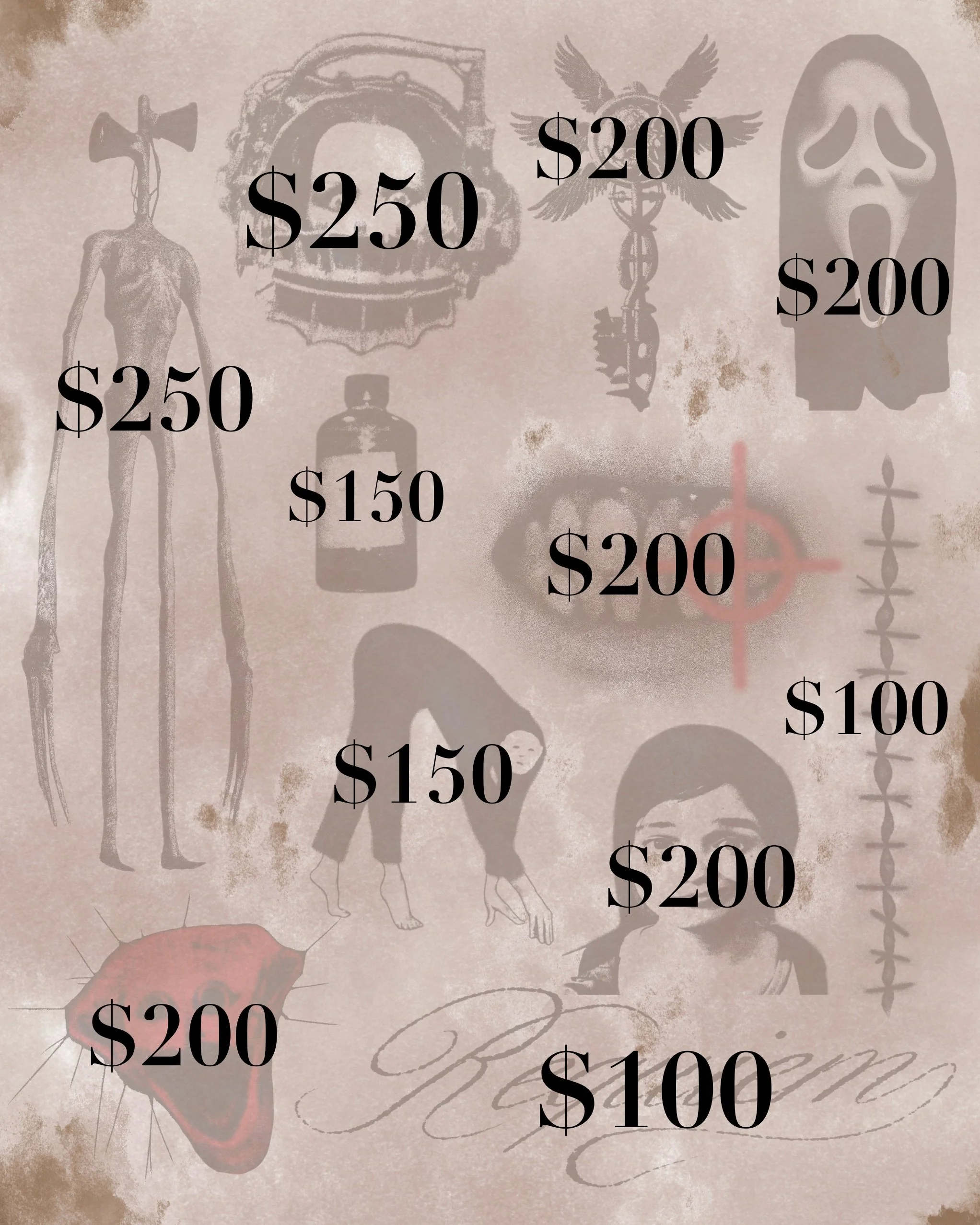 All designs are priced at $100 which will be your deposit to claim the flash. You will receive a confirmation email immediately after and then I will reach out to send you the scheduling link to book (that may take longer, don’t panic). These are all single use designs.